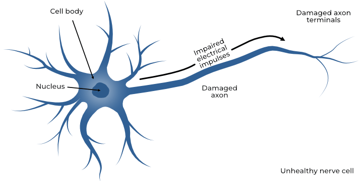 The axon breaks down, especially at the far end (distal part) and signal conduction is impaired or lost entirely. The electrical signal (action potential) may fail to propagate effectively down the axon.